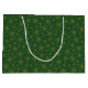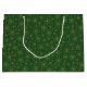 Um verde-escuro bonito e rico fornece um fundo para flocos de neve dourados de todos os tamanhos e formas. Esta design é elegante e sofisticada. Este saco de presentes é a resposta para os desafios de embrulhar presentes. Está disponível em um acabamento brilhante ou mate. Recomendo o final brilhante com este design. Coordenando itens disponíveis na minha loja.