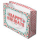 Esta bolsa de presentes apresenta um feliz feriado feliz saudando em uma tipografia do estilo vitoriano moderna, em um fundo sagrado rosa e vermelho.
