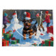 Uma ilustração de feriado emocionante com um cachorro alegre brincando na neve, usando um chapéu de Papai Noel e cercado por caixas de presentes coloridas. Ao fundo, crianças constroem um boneco de neve ao lado de uma árvore de Natal coberta de neve, criando um mundo mágico de inverno. Perfeito para espalhar alegria natalina e capturar a magia do Natal.