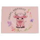 Floffy Pink Highlands Scottish Cow, este design apresenta uma bonita e Fluffy Pink Highlands Scottish Cow com olhos sonoros, rodeada por flores. Um design bonito para qualquer Festa de aniversário de criança.