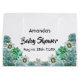 Uma bolsa de presente elegante para um Chá de fraldas. Decorados com plantas suculentas, cactos, flores cactos num fundo na moda branco. Flores em prata, verde e cinzas. Modelos para o nome das noivas e data do chá, letras pretas.
