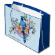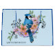 Um pássaro azul rodeado por flores de primavera cor rosa, púrpura e pêssego colorido colorido contra um pano de fundo azul claro.