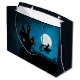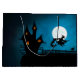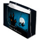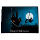 a witch flying on her broomstick past the full moon with a dark house in the background and a cat on the fence