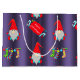 Esta bolsa de presente de Natal azul giro tem um padrão de pequenos elfos de Natal (ou Papais noeis auxiliares) com chapéus vermelhos, pontiagudos e barbas longas e pontiagudas. À sua volta estão pequenas canetas doces, cartazes de Natal felizes e meias de Natal listradas e multicoloridas.