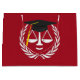 Saco de presente de formatura em Faculdade de Direito Criativo com escalas criativas de justiça com um boné preto e ouro em fundo vermelho para seu formando de advogado favorito.