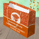 Personalize este grande saco de presentes de graduação em um esquema de cor laranja e branca, um pouco de brilho falso para o aspecto elegante do brilho, um boné de formatura clássico e design de fita e três modelos de texto para que você possa criar o saco de presentes personalizado perfeito. A metade inferior desses sacos de presentes é laranja com três linhas de texto branco em negrito, onde você pode adicionar seu nome de formando, parabéns e CLASSE DE 20XX (adicionar o ano de graduação) ou qualquer texto curto que quiser. A metade superior desses grandes sacos de presente de graduação personalizada tem um fundo de brilho fino alaranjado, um círculo branco parcial e o tradicional prato de mortalha e motif em combinação com o faísca laranja. Perfeito para o seu segundo grau ou formando universitário, crie a bolsa perfeita de presente laranja e branco para o seu formando e apresente o seu presente de uma forma verdadeiramente única.