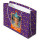 Enrole seus presentes em um saco de presentes roxo festivo e comprido que apresenta uma exibição divertida de estrelas e círculos laranja e amarelo. Personalize esta brilhante design com uma foto do seu aniversariante ou menina, completa com um lindo chapéu azul de aniversário. Adicione um toque especial com uma saudação personalizada, como "Feliz Aniversário, [nome da criança]!." Este saco de presentes brancos é perfeito para qualquer festa de aniversário de criança e adiciona um toque de magia a cada presente.