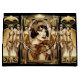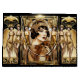 Uma linda garota morena à la mode é garçonne está usando uma blusa brilhante fora dos ombros em dourado falso e uma faixa para a cabeça que parecem cintilar e brilhar contra um fundo preto. Ela está usando uma grossa delineador preto e batom vermelho escuro que faz com que sua pele de porcelana pareça irradiar luz e está enquadrada em uma moldura ornamentada em estilo art déco retrô, dourada falsa. Ladeando-a estão três dançarinas glamourosas em vestidos justos de cetim dourado. Elas estão subindo em um palco prestes a dançar a noite toda. Este design é ideal para um tema de "grande gatsby", "anos loucos", "garçonne dos anos 20" para aniversário, chá de noiva, casamento ou aniversário. É ideal também para projetos de decoupagem e scrapbooking.