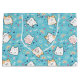 Um saco-presente grande com um padrão de gato giro, colocado sobre um fundo azul e decorado com arco-íris e estampas de pata e muito mais.