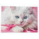 Bonito gato branco com olhos azuis e fitas cor-de-rosa emaranhadas a rosa.