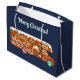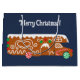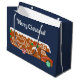 Este saco de presentes está pronto para ser personalizado com a sua própria mensagem e apresenta uma ilustração festiva de um RV de pão de gengibre. Esta camisa da classe C de biscoitos é decorada com gelo branco e doce de Natal vermelho e verde. O gráfico é definido sobre um fundo azul marinho com seu texto personalizado acima em letras brancas.
