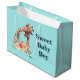 Saco de presente de bebê com um desenho fofo em aquarelas de uma mãe e girafa bebê. A girafa-mãe está descansando a cabeça sobre a girafa do bebê, amorosa e adorável. Bonito buquê rosa, amarelo, verde, de flor de aquarela colocado debaixo deste par de queridos. Um fundo gradiente criado com uma delicada mistura de cor azul turquesa numa cor castanho arenoso.