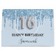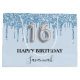 Elegante, clássico, glamouroso e feminino para uma doce 16, 16 festa de aniversário. Um bebê azul-tenente, fundo azul-claro. Decorado com pingos de brilho sujo, aparência de pingar tinta. Personalize e adicione um nome. Com o texto: Parabéns. O nome é escrito com um moderno estilo escrito à mão. O número 16 é escrito com uma fonte no estilo do balão.