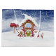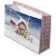 Entre no espírito de feriado com este saco de presentes de gnomos gnomos gnomos, vermelhos e brancos, em frente a uma neve coberta de casa.