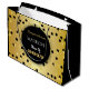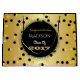 Adicione um toque pessoal ao seu presente. Um belo saco de presentes com preto e ouro divertidos, embelezamentos de ouro elegantes e nome do formando.