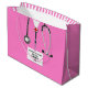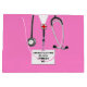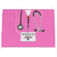 Saco de doação para graduação em medicina criativa para formando médico com esfregões de hospital cor-de-rosa e estetoscópio. Editar texto para adicionar o nome de médico, assistente médico ou enfermeiro e as credenciais médicas.