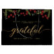 Make your holiday gifting truly memorable with this elegant black gift bag featuring illustrated winter greenery, red berries, and a shimmering gold script that reads “grateful.” Designed for businesses who want to elevate their seasonal packaging, this bag includes customizable text for your company name and year. Perfect for corporate gifting, client appreciation, boutique packaging, employee presents, and festive retail wrapping. A sophisticated, cohesive way to express gratitude during the holiday season.