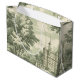 A classic Toile de Jouy pattern gift bag in deep muted green featuring rolling countryside scenes, charming village details, and vintage hot air balloons drifting above the landscape. This elegant monochromatic design captures a timeless French aesthetic. Ideal for lovers of traditional décor, cottage style, travel-themed art, and unique vintage-inspired gifts.