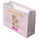 Large gift bag for 1st birthday gift: This cute gift bag for a little girl turning one features a happy puppy, a cake and balloons. Personalize it with the birthday girl's name to make it even more special. The back is full of little puppies joining the party :-) Also check out my matching birthday cards in various sizes. Also available for little boys in blue. Designed by Best Baby Gifts - given with love.