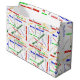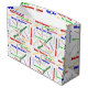 Saco de presente de impressão de Natal feliz e meio brilhante com impressão de cor vermelha, verde, azul e ouro em fundo branco.