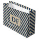 Esta "Iniciais personalizadas Blue/Vanilla Stripes Large Gift Bag" apresenta listras azuis e baunilha e pode ser personalizada com as iniciais do receptor. Torne seus presentes ainda mais memoráveis com este na moda e este saco de presentes personalizável.