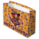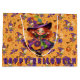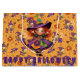 A Cute Orange Childs Large Gift Bag For Halloween Patterned In Little Witches And Pumpkins With Colorful Witch Center And Happy Halloween
