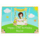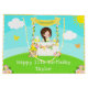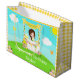 Essa bolsa de presente de aniversário fofa e caprichosa pode ser personalizada com um nome ou título como filha, neta, sobrinha, amiga etc. Apresenta uma cabeleira castanha com pele clara num suporte de limonada amarela que é decorado com flores e beliche. Ao fundo está um céu azul, sol e borboletas. Isto é perfeito para uma festa de aniversário de verão. Gráficos de MUJKA