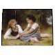 O sol quente do outono passou pelas folhas da avelaneira, lançando sombras dançantes no chão da floresta. Duas jovens, Elise e Juliette, sentaram-se debaixo dos seus ramos, uma pequena pilha de loucos ouros aninhados entre as folhas caídas. - Elise, a anciã dos dois, inclinou-se contra o latido áspero da árvore, um tom malicioso nos olhos. Ela segurou um punhado de loucos rasgados sobre a cabeça de Juliette. "Tente pegá-los, petite souris!" ela fugiu, espalhando os loucos com um riso encantador. - Juliette, um turbilhão de movimento, perseguida depois dos loucos em queda, seu riso ecoando pela floresta. Ela esfregou um punhado, seu rosto escorrendo com esforço e prazer. "Você é impossível, Elise!" ela exclamou, sua voz sem fôlego. Elise resplandeceu-se, seus olhos brilhando nas esquinas. "Essa é a ideia, petite da mãe!" ela retorquiu, jogando mais alguns loucos no ar. - Eles tropeçavam e rolavam entre as folhas, seus risos misturavam-se com o gentil afundamento das árvores. Por um momento, o mundo parecia encolher apenas para os dois, perdidos em seu próprio jogo privado. - Juliette, pegando seu fôlego, olhou em volta para a filtragem de luz solar aplicada através das folhas. "É tão bonito aqui", ela suspirou contente. "Queria que pudéssemos ficar aqui para sempre." - Elise acenou, olhando para cima na cobertura das folhas. "Eu também", ela admitiu. "É como um jardim secreto." - Eles se calaram, contentes na companhia um do outro e na tranquilidade pacífica da floresta. Elise, sempre que sonhadora, começou a imaginar o que eles fariam com seus tesouros. "Talvez pudéssemos assá-los sobre o fogo", ela se divertiu, "e contar histórias a noite toda." - Os olhos de Juliette se alargaram. "Ou talvez pudéssemos fazer um colar para Grand-mère," ela sugeriu, sua voz cheia de entusiasmo. "Ela adora colares de avelã." - À medida que o sol começou a mergulhar abaixo do horizonte, lançando longas sombras pelo chão da floresta, as meninas retomaram suas loucos relutantemente e começaram a chegar em casa. Eles caminhavam de mãos dadas, suas risadas desaparecendo à distância, deixando atrás de um rastro de folhas de ouro e o odor persistente do outono. - O bosque, uma vez vivo com sua brincadeira, voltou ao seu humor pacífico, o único som que o suave sussurro do vento através das árvores. Mas a memória de seu riso, como o cheiro da fumaça, permaneceu muito tempo depois de ter desaparecido, lembrando as simples alegrias da infância e a magia duradoura de um segredo compartilhado. - Les Noisettes ou The Nut Gatherers é uma pintura a óleo de 1882 do artista francês William-Adolphe Bouguereau. Essa obra está no dominio público em seu país de origem e em outros países e áreas onde o termo do direito autoral é a vida do autor mais 100 anos ou menos.