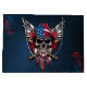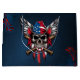 Liberdade selvagem, crânio americano com morcegos de beisebol. O crânio exude uma expressão sombria, marcada por dentes proeminentes e soquetes a jato-preto. Atrás do crânio, dois morcegos de baseball com alças castanhas resistentes se cruzam, simbolizando força e determinação. A combinação do crânio, morcegos de beisebol e bandeira cria uma narrativa visual impressionante da liberdade, rebelião e orgulho americano.