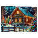Saco de presente de Natal. Uma bela cabana iluminada na véspera de Natal, com luzes de Natal e árvores cobertas de neve.