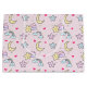 Um padrão fofo com estrelas felizes, lua, nuvens e arco-íris num fundo cor-de-rosa macio e pastel.