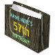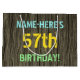 Este design de presente de aniversário divertido apresenta uma mensagem como "NAME-HERE'S 57th BIRTHDAY!", onde o nome pode ser personalizado. O fundo apresenta um padrão de aparência rústico, castanho e falso em grãos de madeira. O texto de mensagem personalizável apresenta cores como azul, amarelo e verde, e tem uma aparência inspirada pela de letras pintadas e estêncilhadas. Uma bolsa de presente de aniversário como esta pode ser uma forma bobo de embrulhar um presente para alguém que comemora seu cinquenta e sétimo aniversário. [~Z0000319]