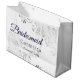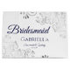 Estes belos sacos de presentes são desenhados como um presente de casamento ou bolsa de favores para as suas madrinhas. Eles apresentam um design simples, mas elegante, com fraldas de folha fina prateada e texto azul marinho lendo "Bridesmaid" escrito em letras ricos de script. Há também um lugar para digitar seu nome, o nome do casal e a data do casamento. Preencha com presentes, favores, doces, ou qualquer outro saco de casamento ou obrigado que você dá. Uma bela maneira de a obrigado por fazer parte do seu dia especial.