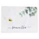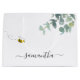 Um fundo branco chic. Decorado com um eucalipto de cor aquosa verde, folhagem e uma abelha sorridente e feliz. Personalize e adicione um nome. O nome é escrito com um moderno estilo escrito à mão com traços. Para manter as hastes, exclua apenas o nome da amostra, deixe os espaços ou emoji na frente e depois do nome. Perfeito para embalagem de presente ou para favoritos para festas de aniversários, chás de panela e chás de fraldas.