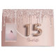 Um saco de presente para uma Quinceañera, menina glamourosa e giro, 15. Um fundo rosa dourado com rosa dourado e brilho cor-de-rosa pingando, aspecto de pingar tinta. Personalize e adicione uma foto e um nome. O número 15 é escrito com uma fonte no estilo do balão. Perfeito como um saco de favores ou como um saco de presentes.