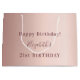 Um saco de presente para um aniversário de 21 ruas (ou qualquer idade) feminino e glamouroso. Um fundo rosa dourado, cor-de-rosa, fino, metálico. O texto: O nome é escrito em ouro rosa escuro com uma escrita de estilo moderna, escrita à mão. Com o texto: Feliz Aniversário! Personalize e adicione um nome e idade 21.