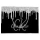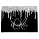 Um fundo preto clássico com brilho fino de prata pingando, pintura pingando. Personalize e adicione um nome e iniciais de monograma. O nome é escrito com um moderno estilo escrito à mão. Letras brancas e cinzas. Perfeito para aniversários, chá de panela, chá de fraldas.