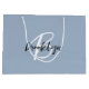 Este saco de presentes personalizado apresenta um monograma e primeiro nome em um roteiro preto e branco moderno sobre um fundo azul tendencioso, com o texto adicional na fonte sans serif negra abaixo.
