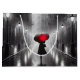 Uma mulher com um guarda-chuva vermelho caminha por uma rua da cidade chuvosa e escura iluminada por postes antigos.