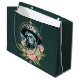Mulher espantosa adorada com uma espantosa maquiagem do crânio de açúcar. As cores brilhantes e os intrincados padrões contam histórias de vida e morte, dando a ela um olhar alegre, mas respeitoso, que é perfeito para Día de los Muertos. Seu cabelo longo e fluente brilha uma brilhante turquesa que flui sobre seus ombros como uma cachoeira de cor. Ele pega a luz e melhora o humor festivo do design. O fundo brilha em azuis profundos e verdes, lembrando um céu noturno, enquanto flores delicadas, rosa e brancas, dançam ao seu redor. Estes sotaques florais não só adicionam cor, como também simbolizam o amor e a memória do falecido.