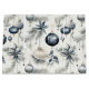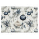 A imagem mostra Enfeites de natal elegantes, azuis e dourados sobre fundo branco, complementados por uma poinsettia azul.