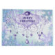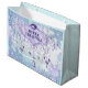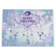 Saco de presente de floco de neve congelado de inverno com lindos flocos de neve azuis-esverdeados em um fundo roxo e azul-esverdeado gelado com etiqueta de joia roxa para o seu texto.
