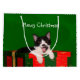 O gato preto e branco do smoking senta-se sobre os presentes e deseja-se a cada um saco do presente de época natalícia do Natal dos amantes do gato do Natal de Mewy (o texto pode facilmente ser mudado ou removido)