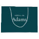 Um saco de presentes de Natal para fotos moderno, na moda, com seu sobrenome na tipografia clássica, emparelhado com uma letra manuscrita em branco, sobrepondo lindamente sua fotografia do tamanho do cheio. Esta design única e mínima fará a sua foto brilhar nesta época de Natal, com um rico verde negro para um toque extra de elegância. A imagem de exemplo é apenas para ilustração e pode ser substituída por sua própria foto estimada.
