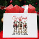 Celebre o feriado com essas vacas adoráveis vestindo chapéus festivos de Papai Noel! Esses animais de fazenda são perfeitos para adicionar um toque de choradeira à sua decoração de Natal. O texto diz Natal no celeiro.
