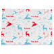 Saco de presentes de Natal, bonito e moderno, apresentando um padrão de cervos de inverno de Natal em azul, vermelho e rosa sobre o fundo branco no estilo simples nórdico. Personalize facilmente o texto. - Kate Eden Art