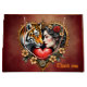 O coração da selva oculta, um tigre majestoso, e o perfil de uma mulher são maravilhosamente misturados. Ambos os modos estão inseridos em uma elegante estrutura em forma de coração, destacando o humor romântico. O quadro é ricamente decorado com delicados padrões florais que fluem harmoniosamente ao seu redor, dando-lhe um toque lúdico e imaginativo. Em meio às flores há um coração vermelho brilhante, simbolizando amor e paixão.