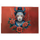O segredo da beleza pálida, a linda garota japonesa. Seu cabelo está preso num pão elegante, dando a sua aparência um toque gracioso. Um ponto vermelho brilhante é pregado na testa, criando um ponto focal. Seu rosto é intricadamente decorado com padrões azuis e vermelhos, enfatizando sua individualidade e talvez também simbolismo cultural. Ela veste um manto na moda azul e branco que combina harmoniosamente com as cores de seus ornamentos.