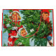 Conseguir a grande bolsa de presente da árvore de Natal em cores brilhantes e vívidas mostra três crianças sorrindo grandes sorrisos e trazendo para casa a árvore de Natal.