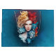 Olhos de Leão e Cabelo Estrelado, a cabeça de uma mulher mística envolta por um halo brilhante de cabelos longos e fluidos, brilha numa fascinante brincadeira de loira e vermelho. Este cabelo flui como uma cachoeira de luz e fogo enquanto brilha em contraste com o fundo azul profundo - um oceano de infinidade. Os olhos, um azul brilhante, parecem guardar os segredos do universo. Aos lados de sua cabeça estão três cabeças de leão - majestosos guardiães de seu mundo misterioso. A cabeça de cada leão conta sua própria história de coragem e sabedoria enquanto eles observam a beleza da mulher em reverência.